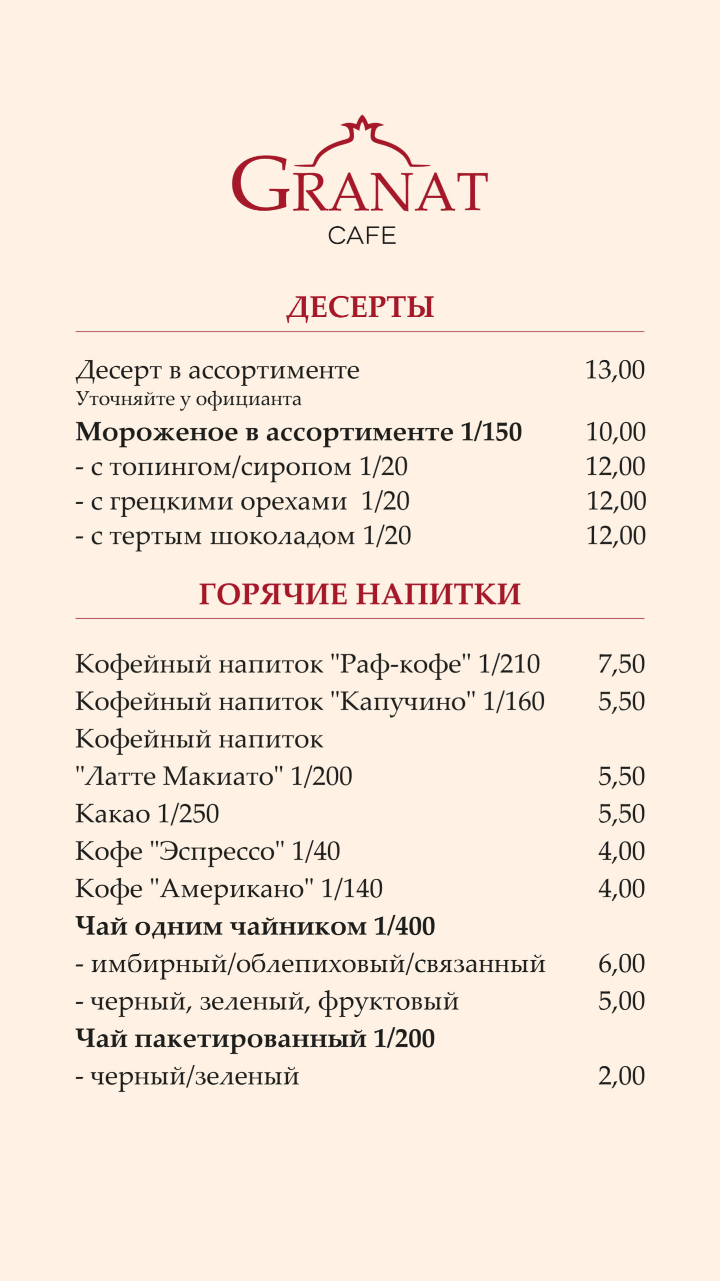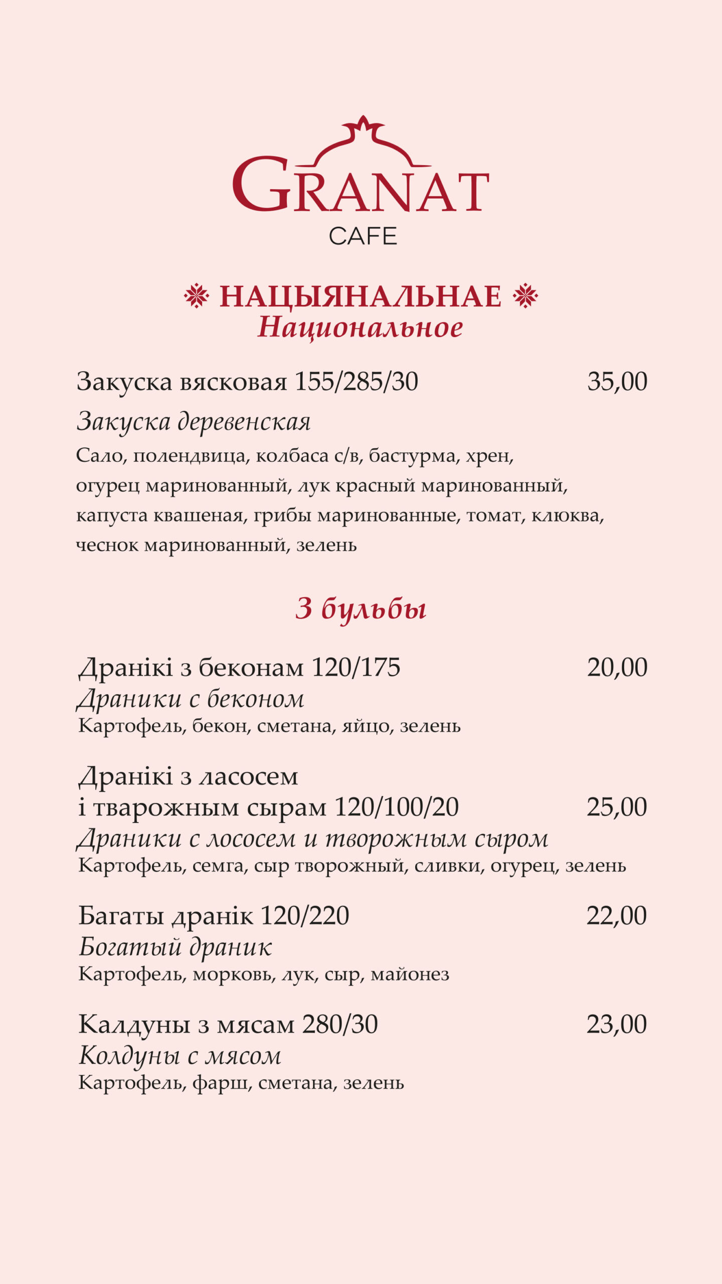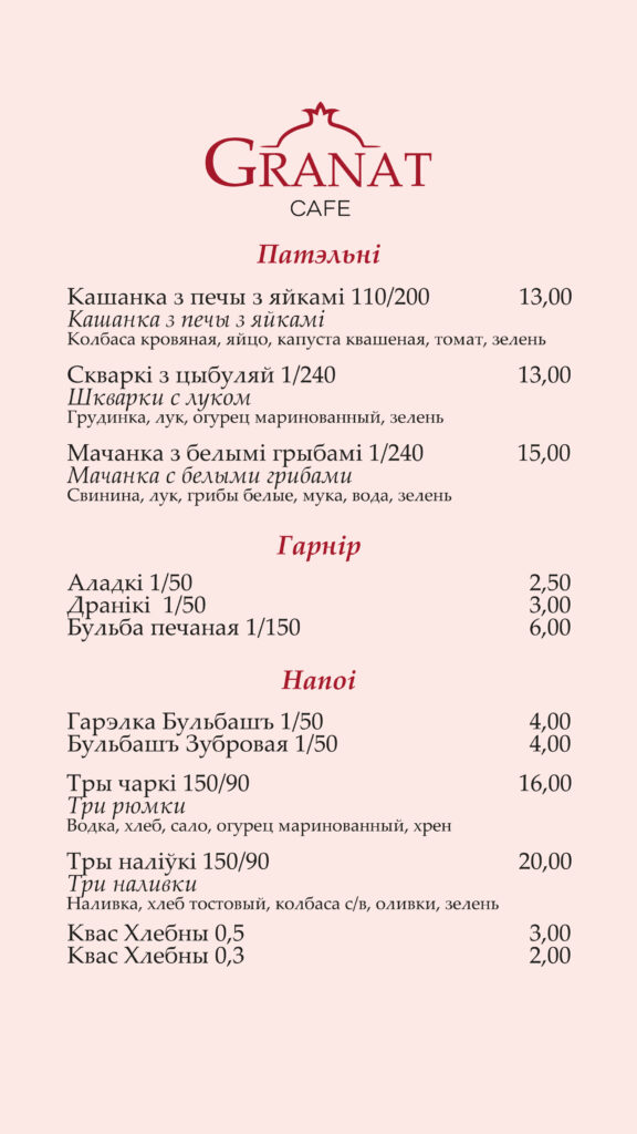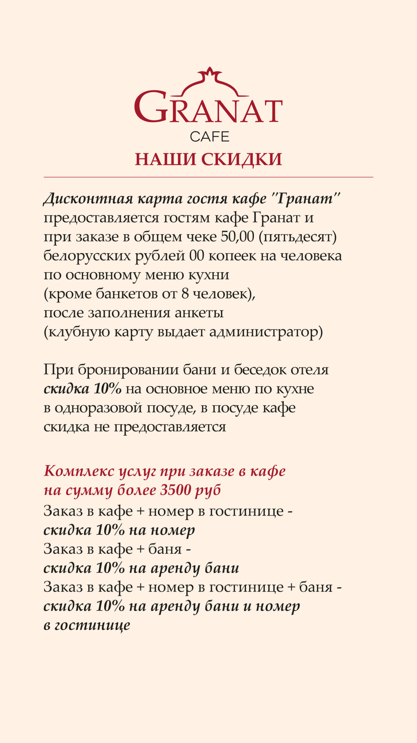 Кафе «Парк-отеля «Гранат». Меню кафе представлено блюдами европейской и белорусской кухни. В кафе отеля Вам приготовят вкусный и питательный завтрак по вашему вкусу с чашкой ароматного кофе или чая и подадут в удобное для Вас время.
