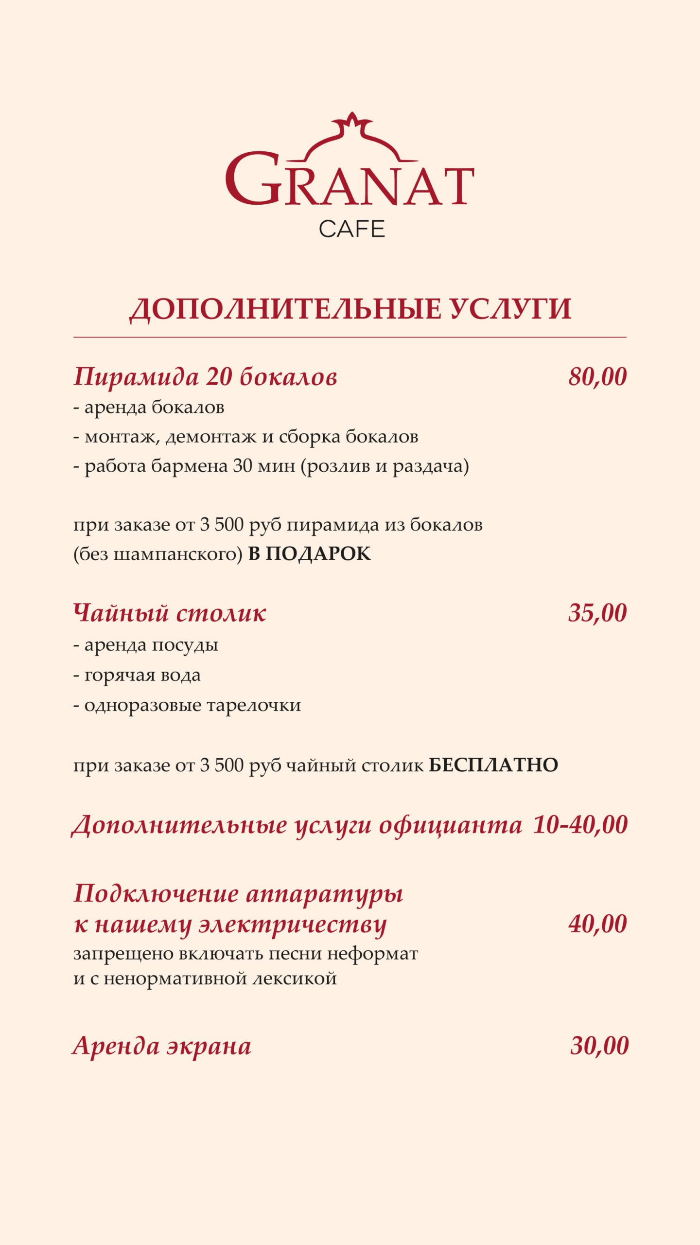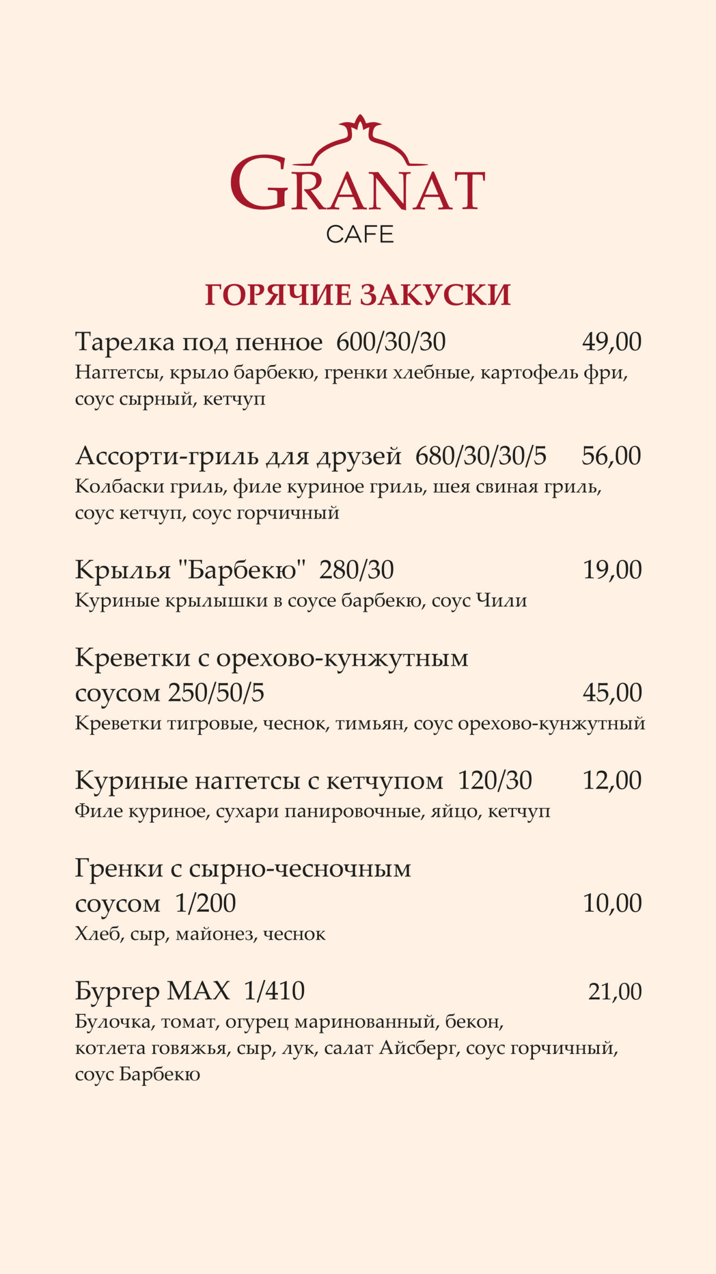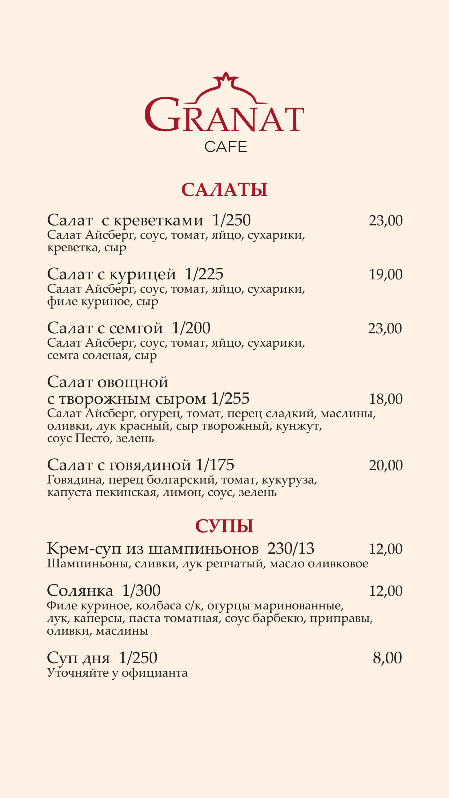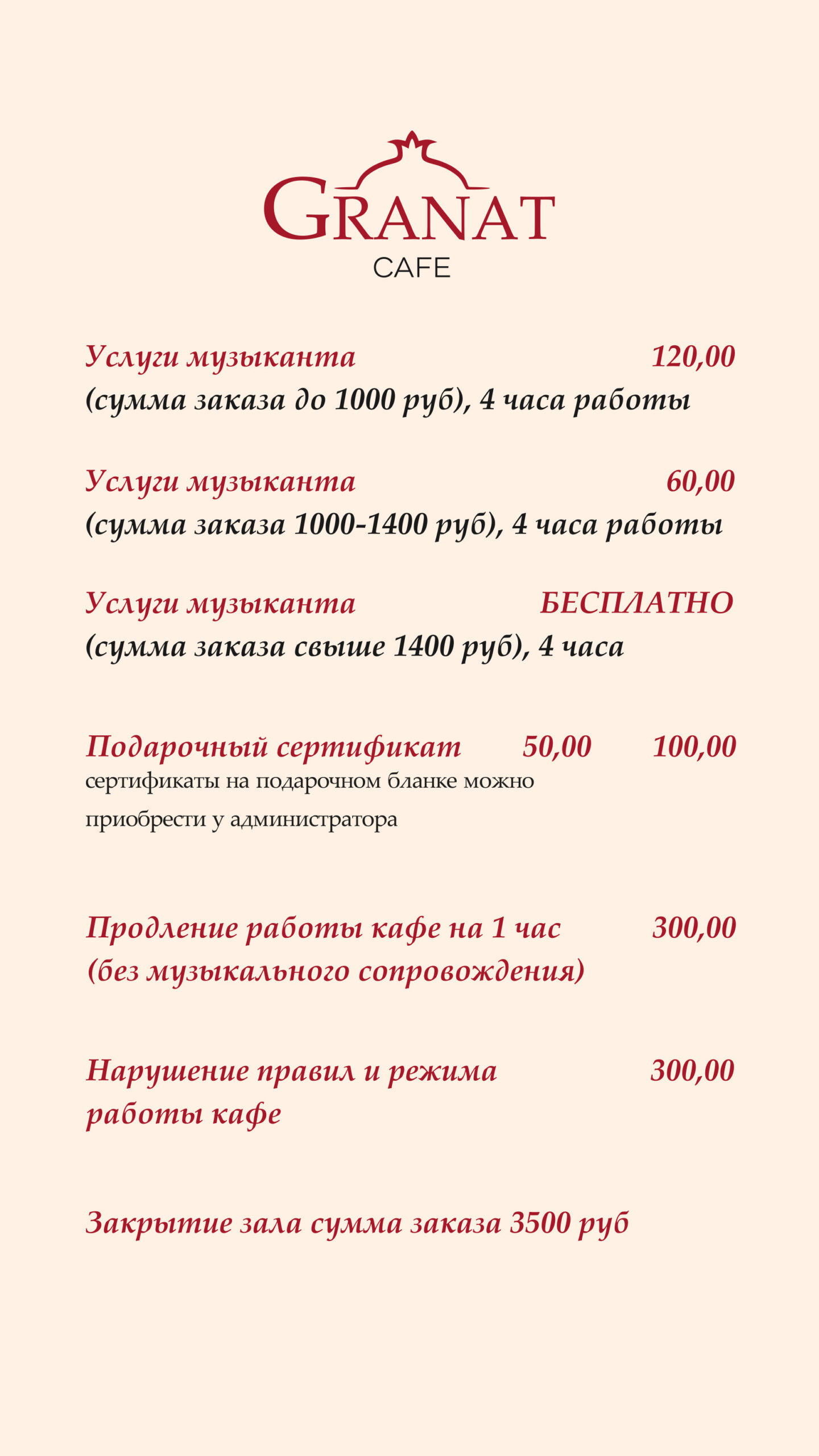 Кафе «Парк-отеля «Гранат». Меню кафе представлено блюдами европейской и белорусской кухни. В кафе отеля Вам приготовят вкусный и питательный завтрак по вашему вкусу с чашкой ароматного кофе или чая и подадут в удобное для Вас время.